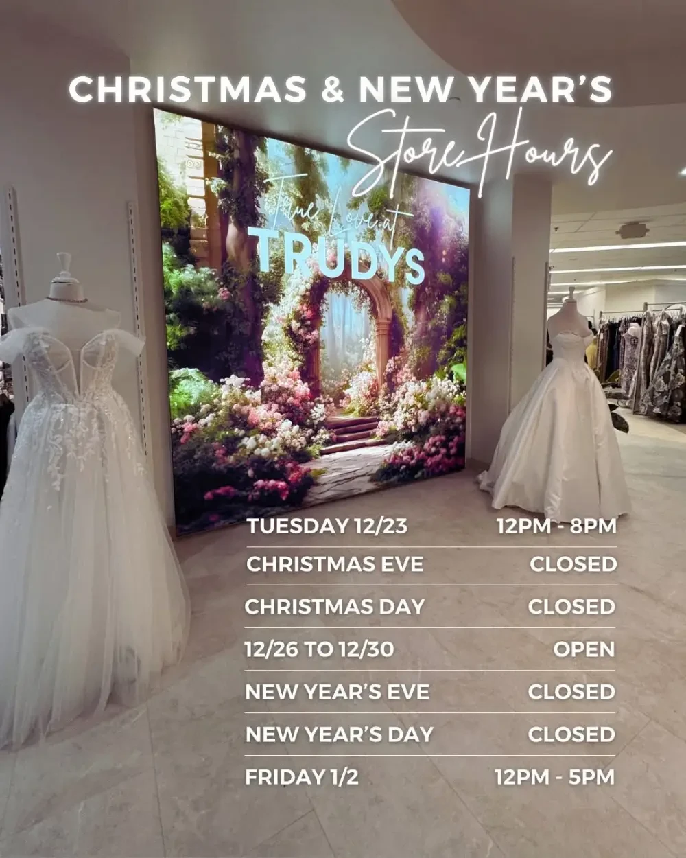 Established in 1974, in The Pruneyard in Campbell, Trudys grew to be one of the leading bridal salons, with one of the largest dress selections in the greater Bay Area, helping generations of Brides, Mothers, Prom and guests for every special occasion. After 51 years Trudys has moved to an expanded new location in Willow Glen/San Jose. Carrying the latest bridal collections from top designers featuring gowns by: Morilee, Allure Bridals, Disney Fairy Tale Weddings, Maggie Sottero, Enzoani, Madi Lane, Mon Cheri, MGNY, Portia Scarlett, Sherri Hill and more. Trudys represents dresses for every size customer from petite to plus to enjoy an inclusive shopping experience. Call today and let Trudys be a part of your special "Say Yes!" dress memories.