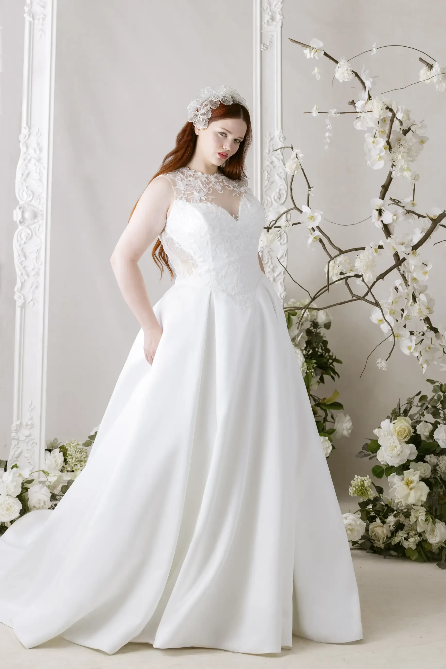 We proudly offer a wide variety of plus-size wedding gowns, typically ranging from size 16 up to size 32 depending on the designer. That range matters, because true size inclusivity isn’t just about having a plus-size option, it’s about carrying styles that are designed to flatter, support, and move with real bodies in a variety of sizes. Our stylists trend-watch constantly and bring in gowns that we know work well for plus-size brides, whether that means thoughtful structure, supportive bodices, flattering seam placement, comfortable fabrics, or silhouettes that highlight your favorite features. We also do our best to stock those gowns in a range of sizes, so you’re not stuck trying to “imagine” what something will look like based on a sample that isn’t even close to your size. You deserve a shopping experience where the dress possibilities feel real and accessible.