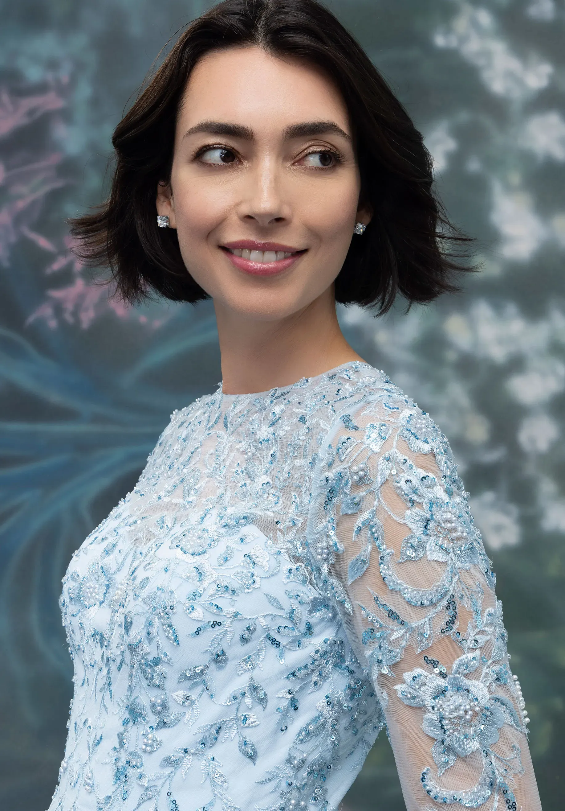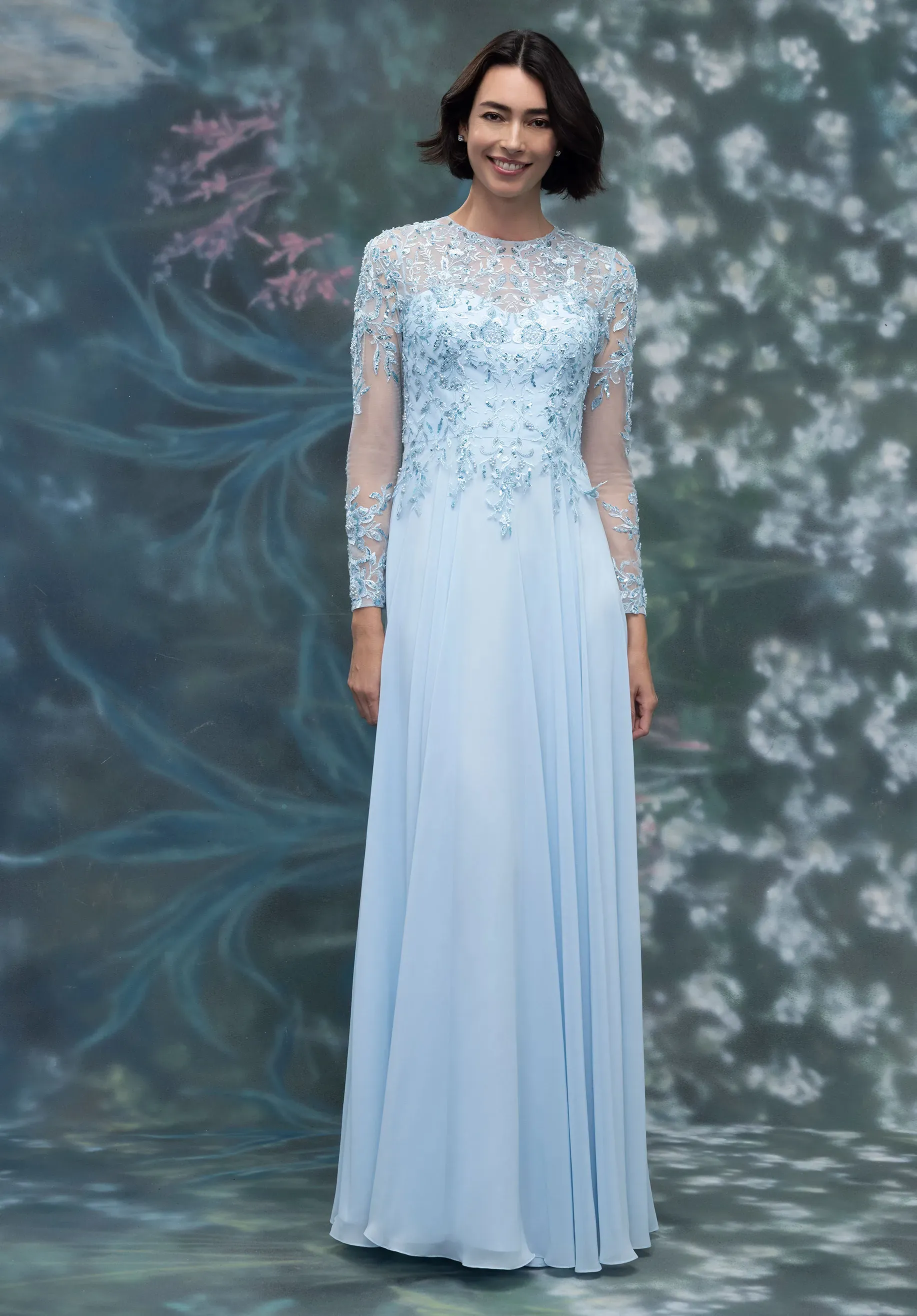 We carry select styles from each designer, and dresses often sell off the floor so availability changes regularly from what’s online.