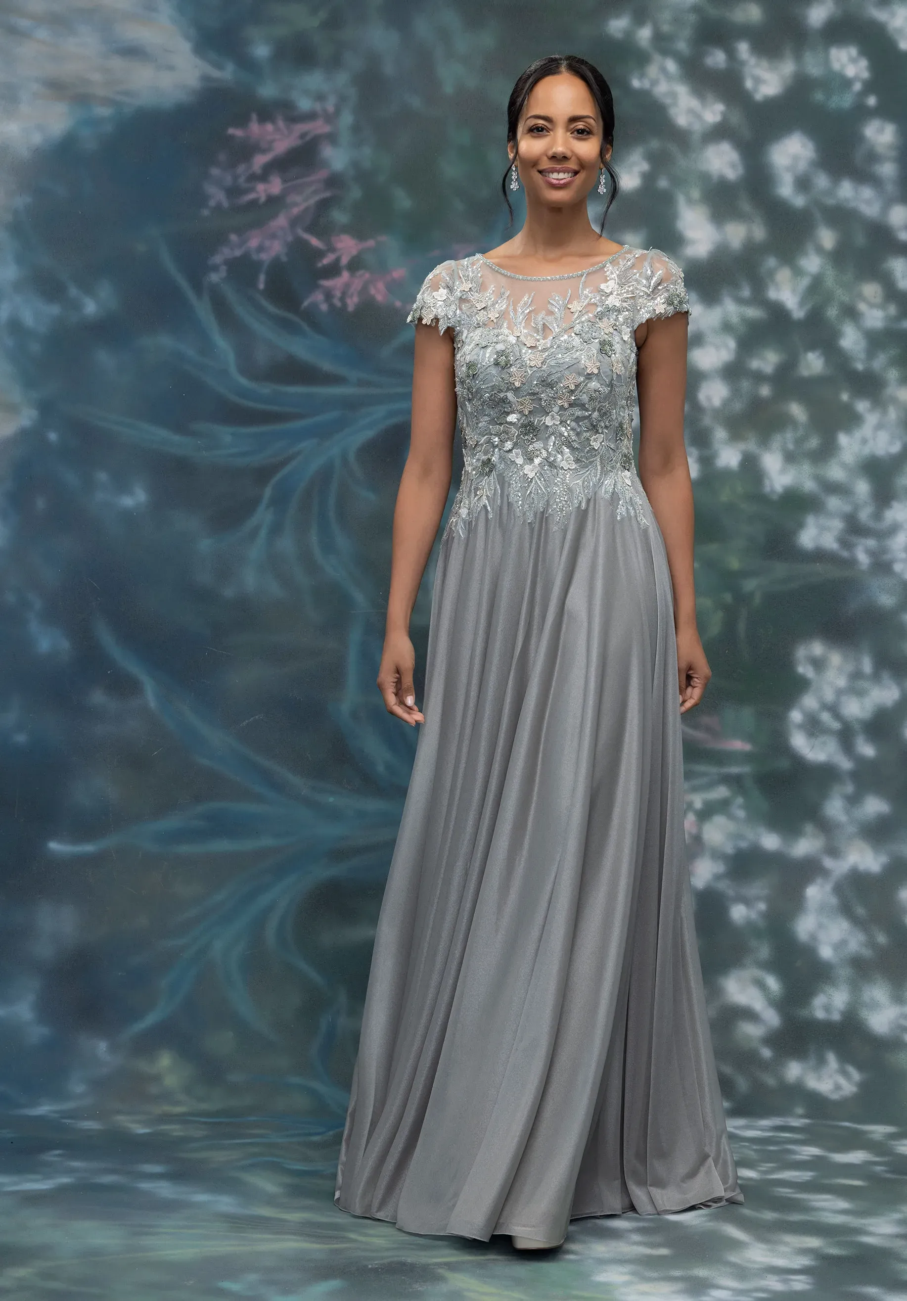 We carry select styles from each designer, and dresses often sell off the floor so availability changes regularly from what’s online.