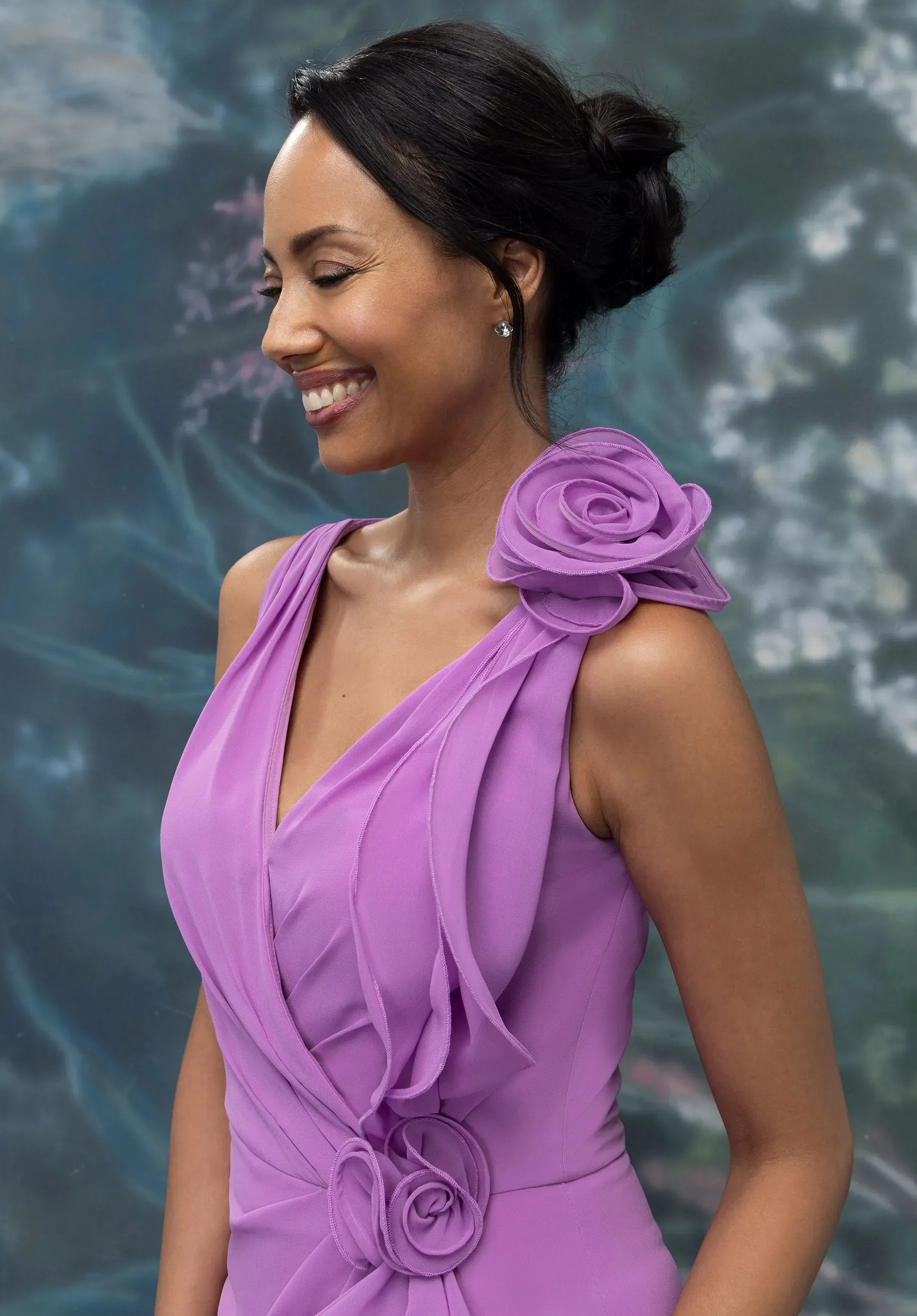We carry select styles from each designer, and dresses often sell off the floor so availability changes regularly from what’s online.