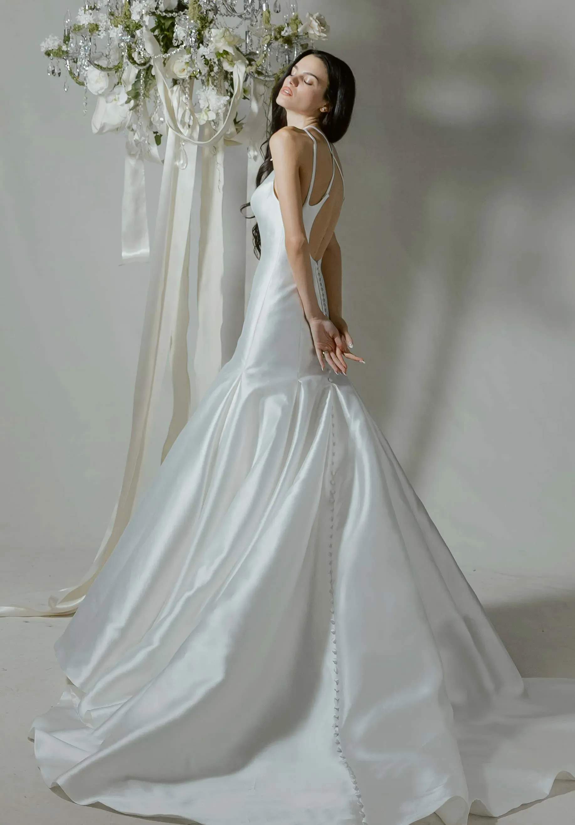 The Lilou wedding dress captures the beauty of refined motion, minimal yet undeniably expressive. The mermaid silhouette elongates the form with sculptural precision, while a halter neckline, detailed with a delicate bow, nods to the effortless grace of a ballerina. An open, strappy back adds a whisper of sensuality, leading to a softly structured box-pleated skirt that flows into a trailing line of buttons. Poised between strength and softness, the gown moves like a quiet rhythm—elegant, deliberate, and endlessly captivating.