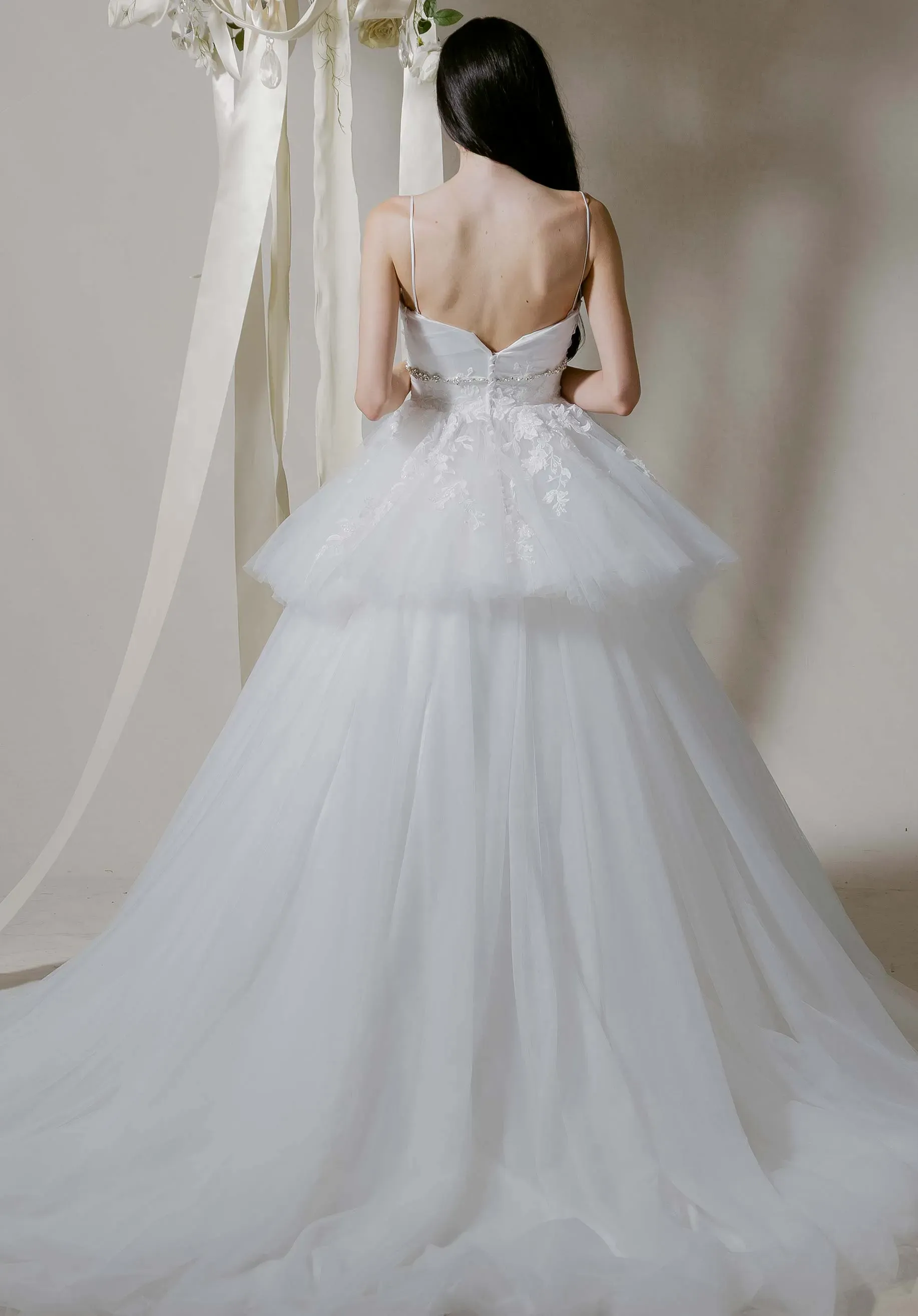 We carry select styles from each designer, and dresses often sell off the floor so availability changes regularly from what’s online.