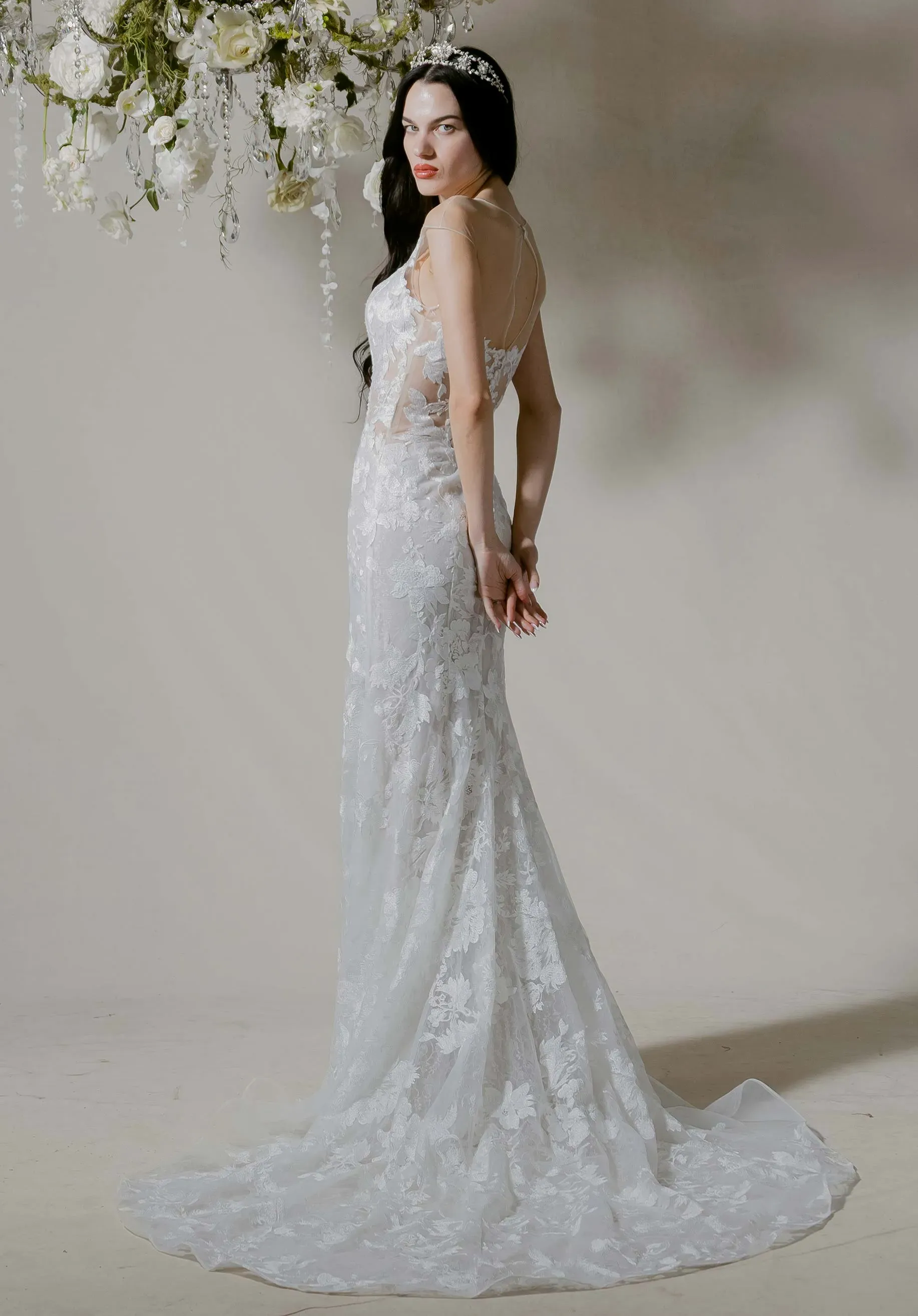 We carry select styles from each designer, and dresses often sell off the floor so availability changes regularly from what’s online.