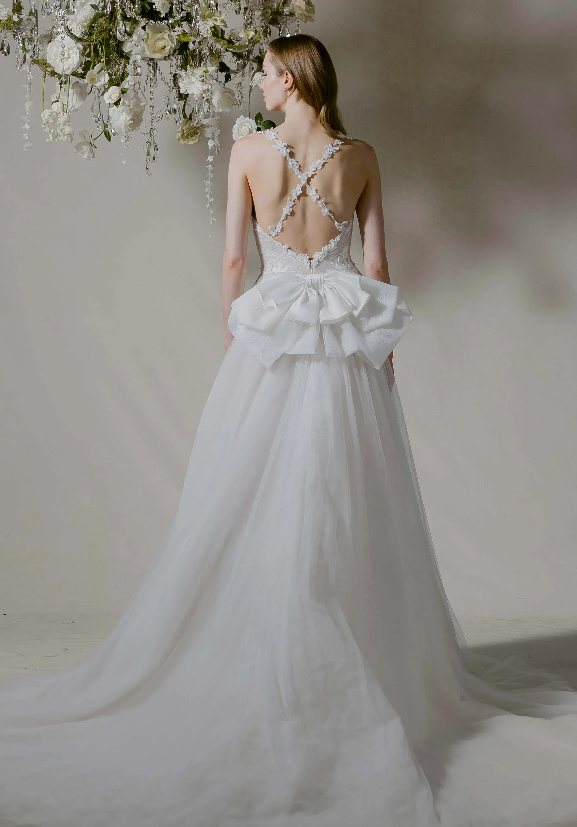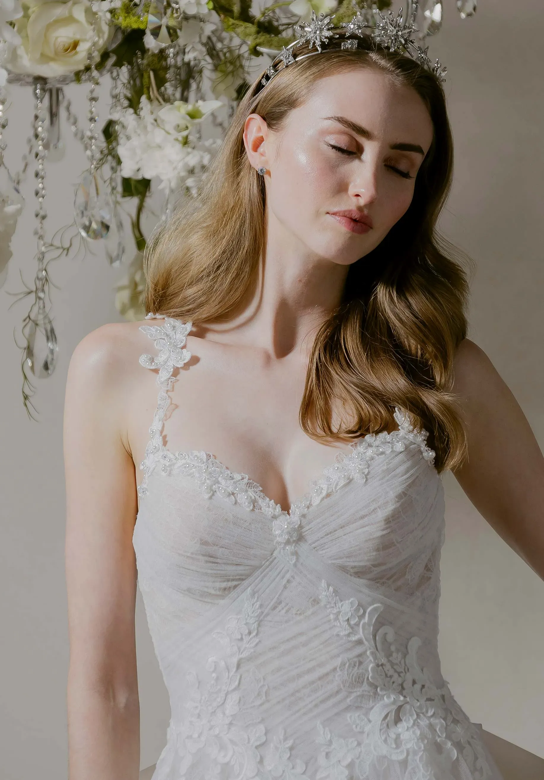 Our Cassia wedding dress is a delicate study in romantic elegance and billowing movement. A soft sweetheart neckline rests atop a ruched bodice adorned with crisscrossing floral appliqués, while slender straps cross along the open back. A gently basque waist sculpt the silhouette with refined grace, flowing into an embroidered English net over Chantilly lace skirt that drifts with airy sophistication. A detachable floral appliqué bow completes the look, offering a touch of sculptural drama and poetic charm,
