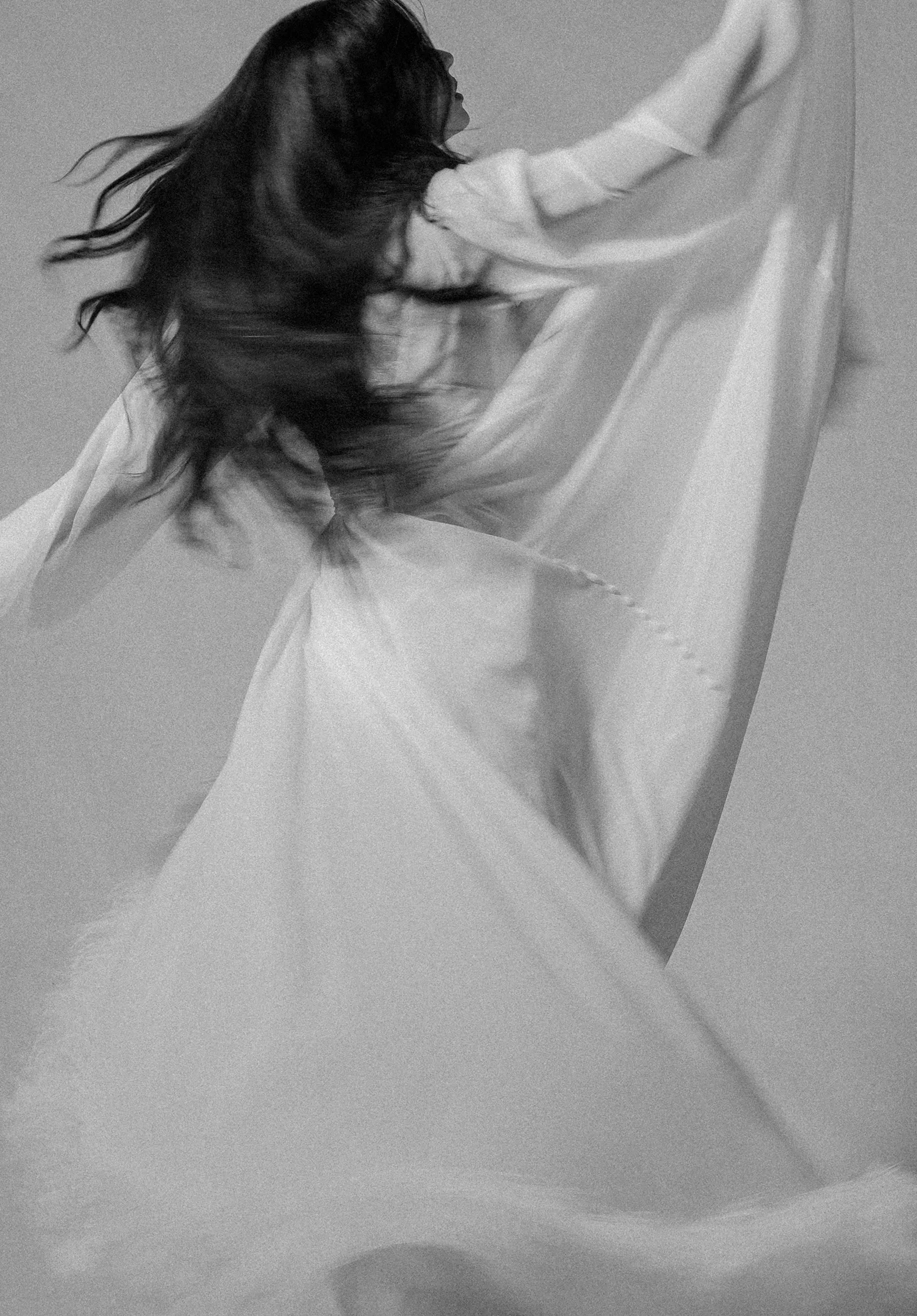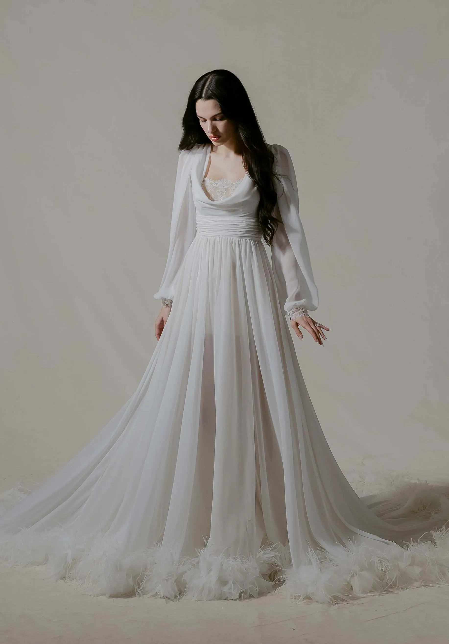 Romantic, whimsical, and effortlessly poised, our Larkspur wedding dress embodies a sense of light, poetic motion. The draped cowl neckline frames the décolletage, accented with a delicate peek-a-boo lace inset, while a V-shaped back edged in lace adds a whisper of allure. Long bishop sleeves and a ruched waistband sculpt the silhouette with graceful refinement, leading to a flowing chiffon skirt finished with a ruffled feather hem that floats with airy movement and adds soft drama to the gown.